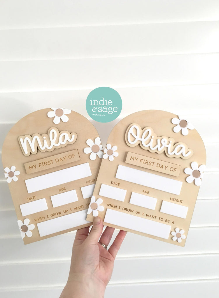 Our personalised first and last day of school boards are perfect for first day of kindergarten photos, preschool milestones, childcare and primary school first day pictures. Designed to be reused year after year, they make it easy to capture those special back-to-school memories as your child grows.