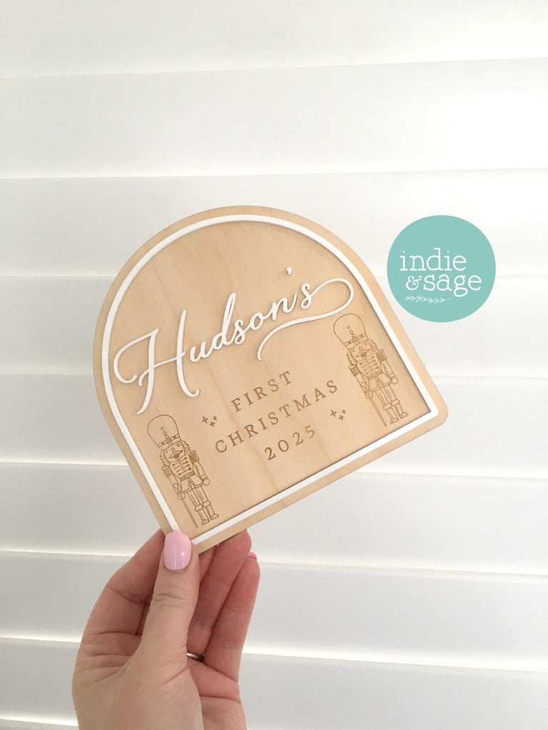 Our beautiful personalised first Christmas plaques are a wonderful photo prop for those special first Christmas keepsake photographs. Personalised with your child's name and featuring a pair of sweet Nutcrackers this will no doubt become a treasure keepsake piece.