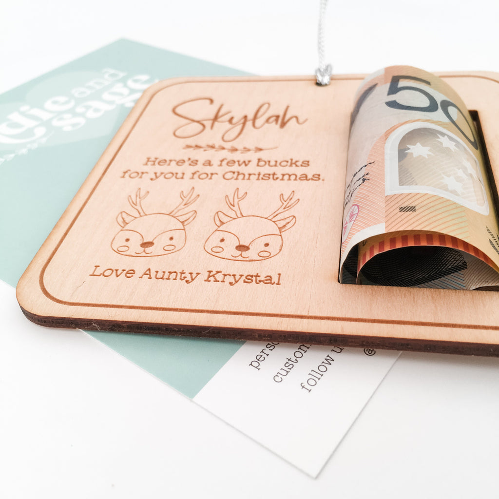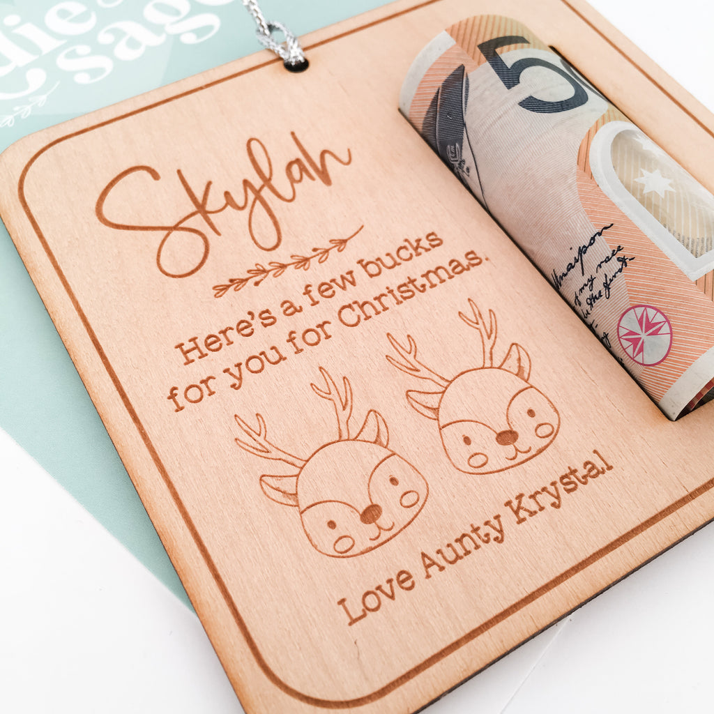 You piece can be personalised with a name of your choosing and will feature the words, "Here's a few bucks for you for Christmas" and has a cute little pair of Christmas bucks underneath. Below this we can sign it off with your details, for example "Love Aunty Krystal".