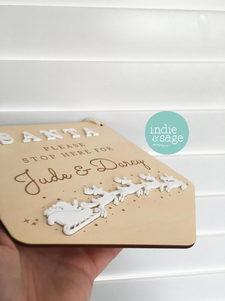 Personalised withy our childs names, the sign asks Santa to please stop and features a beautiful illustrator of Santa and his reindeers, I've added in some beautiful stars and accents behind this to give it a beautiful finish.