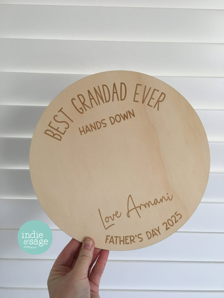 The top section of the plaque will be engraved with, 'Best Dad Ever' and the second line with 'hands down', the piece can be dedicated to whomever you please (Dad, Daddy, Grandad or anyone else!). The bottom of your plaque is personalised with your little peoples names and "Fathers Day 2023".