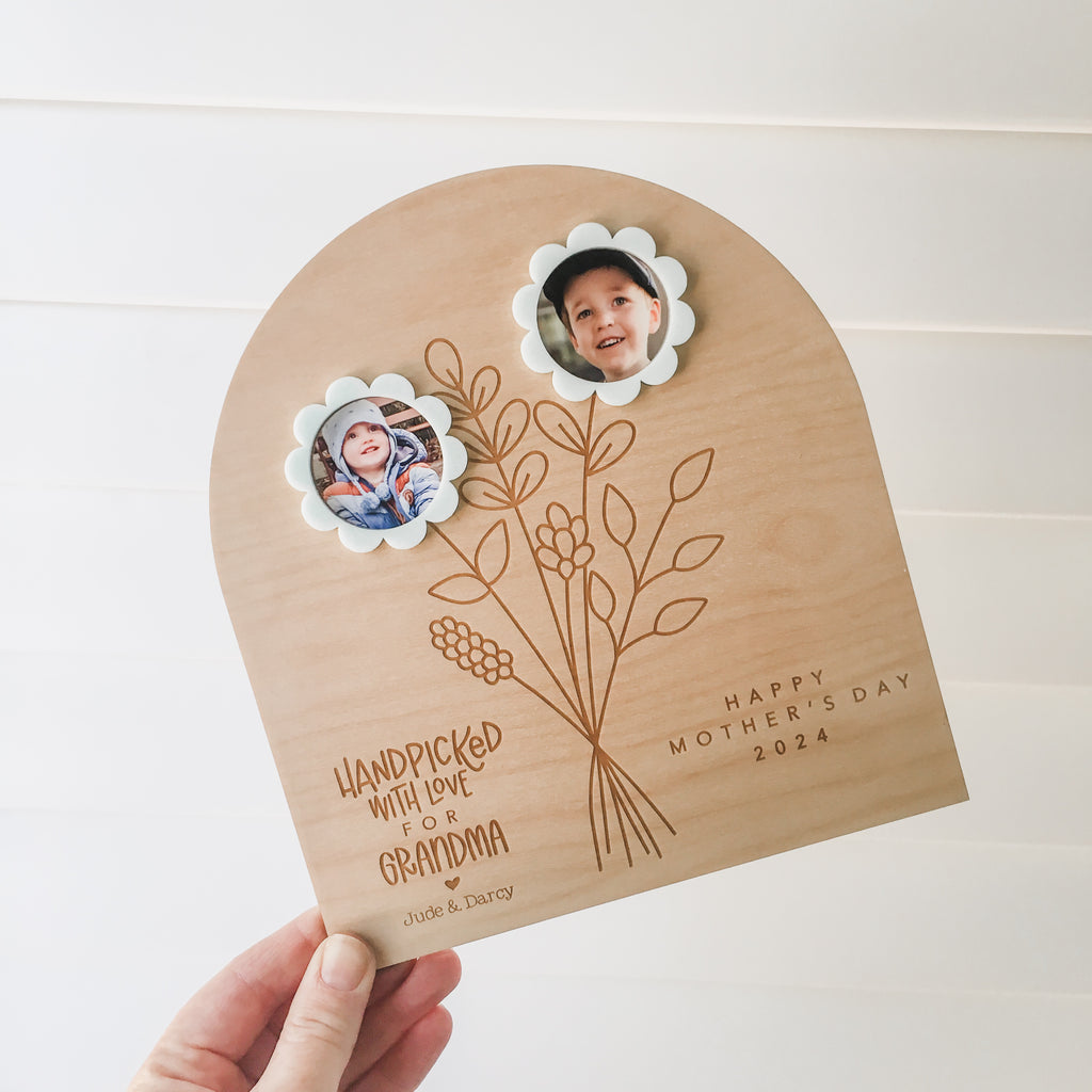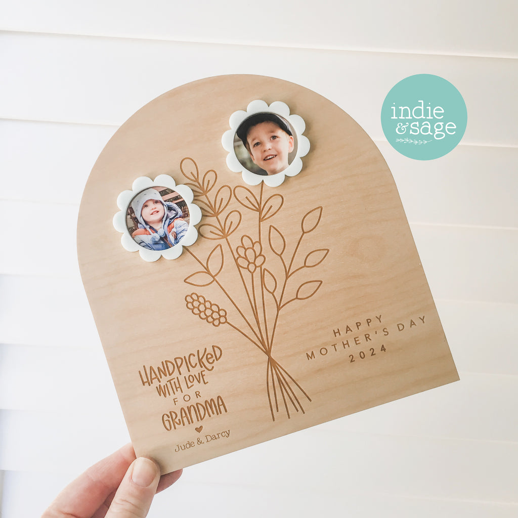 This beautiful Mother's day plaque is engraved with "Hand picked with love by" and can be dedicated to whomever you please (Grandma, Mum, Nanna, Aunty - anyone!) and features a beautiful bunch of flowers with the most divine little raised flowers attached - each of which is a small photo frame which you can personalise with a photo of your little (or big) people! the piece can be signed off by your names (maximum four names).