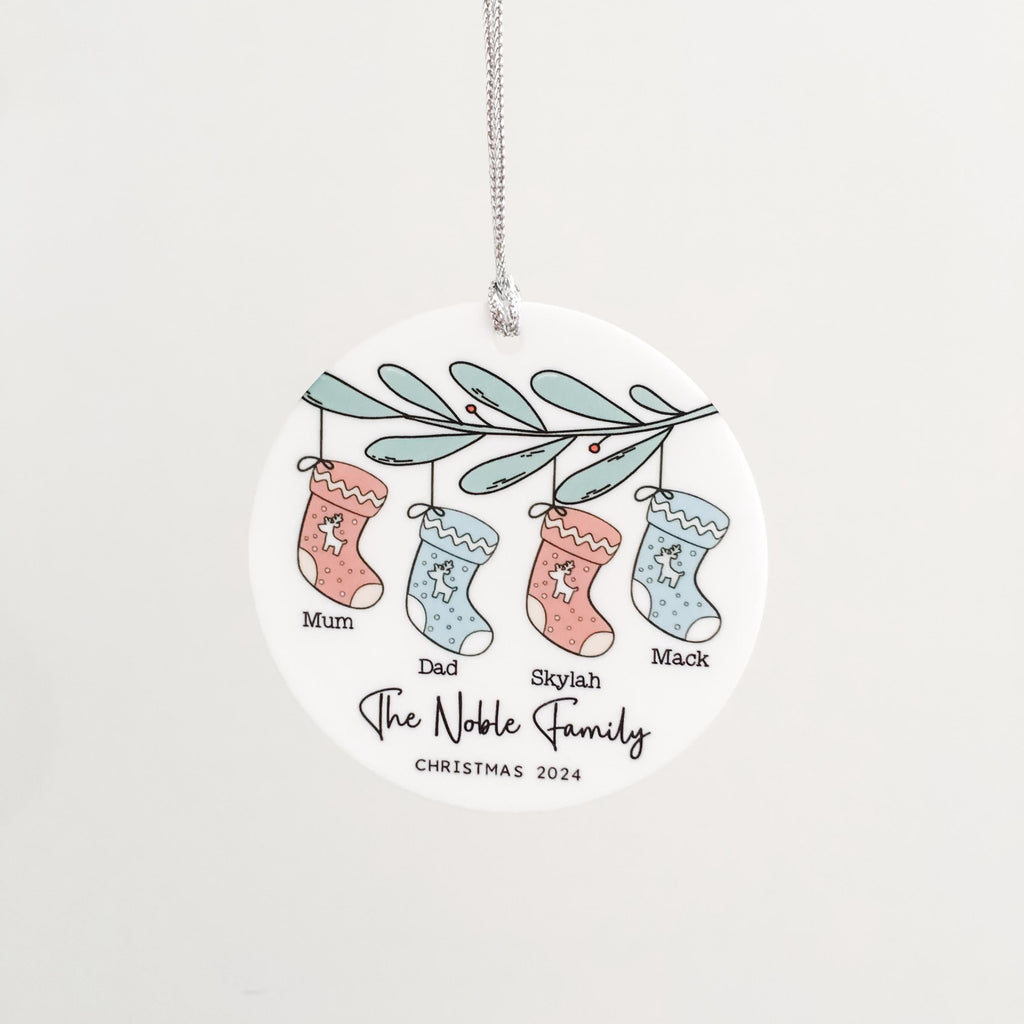 This design was inspired by our beautiful eucalyptus trees which is the most stunning soft green colour, we felt the soft pastel stockings compliment this beautifully. Your ornament will be personalised with your family name and Christmas 2025. We can place a name under each stocking and ask that you let us know which name you would like under each coloured stocking. Please note, we will scale the stockings up or down on your ornament depending on how many you need on there (obviously more stockings required means they will be smaller). Your piece will be finished off with a piece of glittery silver twine so it's ready to hang on your tree.